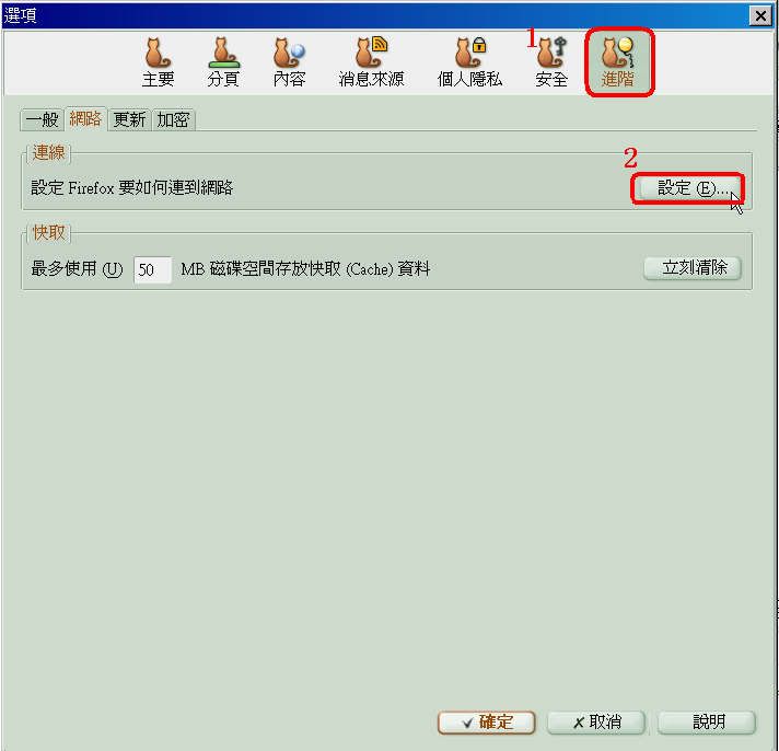 - 填上antiChinaBlockedWeb.pac所在的網址:如antiChinaBlockedWeb.pac放在c:/etc/firefox的目錄下,那麼就要填入file://c:/etc/firefox/antiChinaBlockedWeb.pac 其他選項請依圖選擇。填完後請記得一定要按"重新載入"。